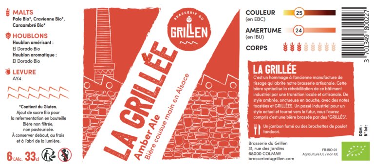 Notes de dégustation : La Grillée est un hommage à l'ancienne manufacture de tissage qui abrite la brasserie artisanale du Grillen. Cette bière symbolise la réhabilitation de ce bâtiment industriel par une transition locale et artisanale. Cette Amber Ale est onctueuse en bouche, avec des notes toastées et grillées ! Un passé industriel pour un style actuel et tourné vers le futur, vous l'aurez compris c'est une bière brassée par des "Grillés". Médaille d'or au concours international de Lyon 2022.