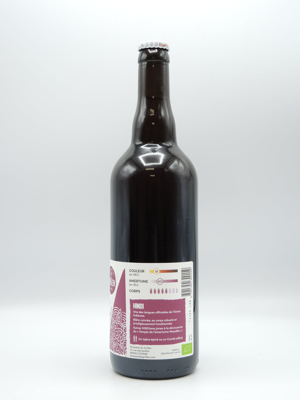 Notes de dégustation : Hindi : Une des langues officielles de l'Union Indienne. Bière cuivrée, au corps robuste et prodigieusement houblonnée. Suivez HINDIana Jones à la découverte du "Temple de l'amertume Maudite"!