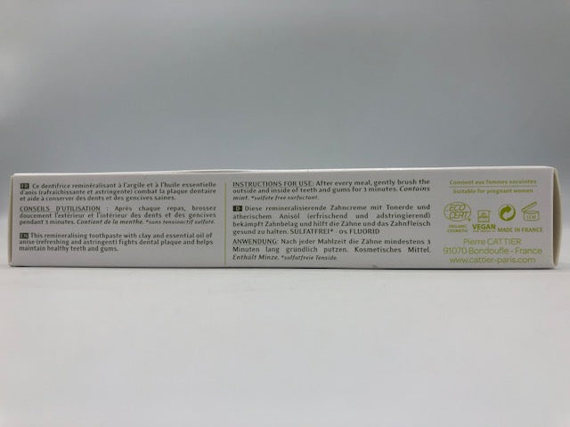 Ce Dentifrice reminéralisant Cattier certifié bio à l’argile et à l’huile essentielle d’anis combat la plaque dentaire et aide à conserver des dents et des gencives saines. Des ingrédients naturels hautement efficaces ont été sélectionnés pour protéger et nettoyer efficacement les dents.