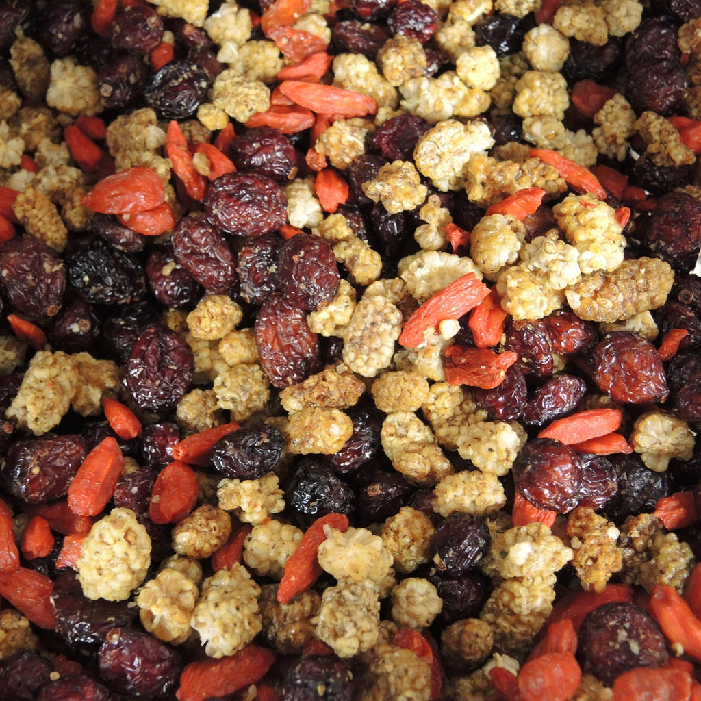 Mélange de fruits secs composé de baies de Goji, mûres blanches et canneberges.