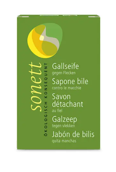 Savon détachant au Fiel de boeuf. Un détachant extrêmement efficace pour les taches de stylo, encre, sang, graisse, fruits etc. Un produit sans expérimentation animale, microplastiques ou pétrochimie, certifié Nature Care Product. Pain de 100g.