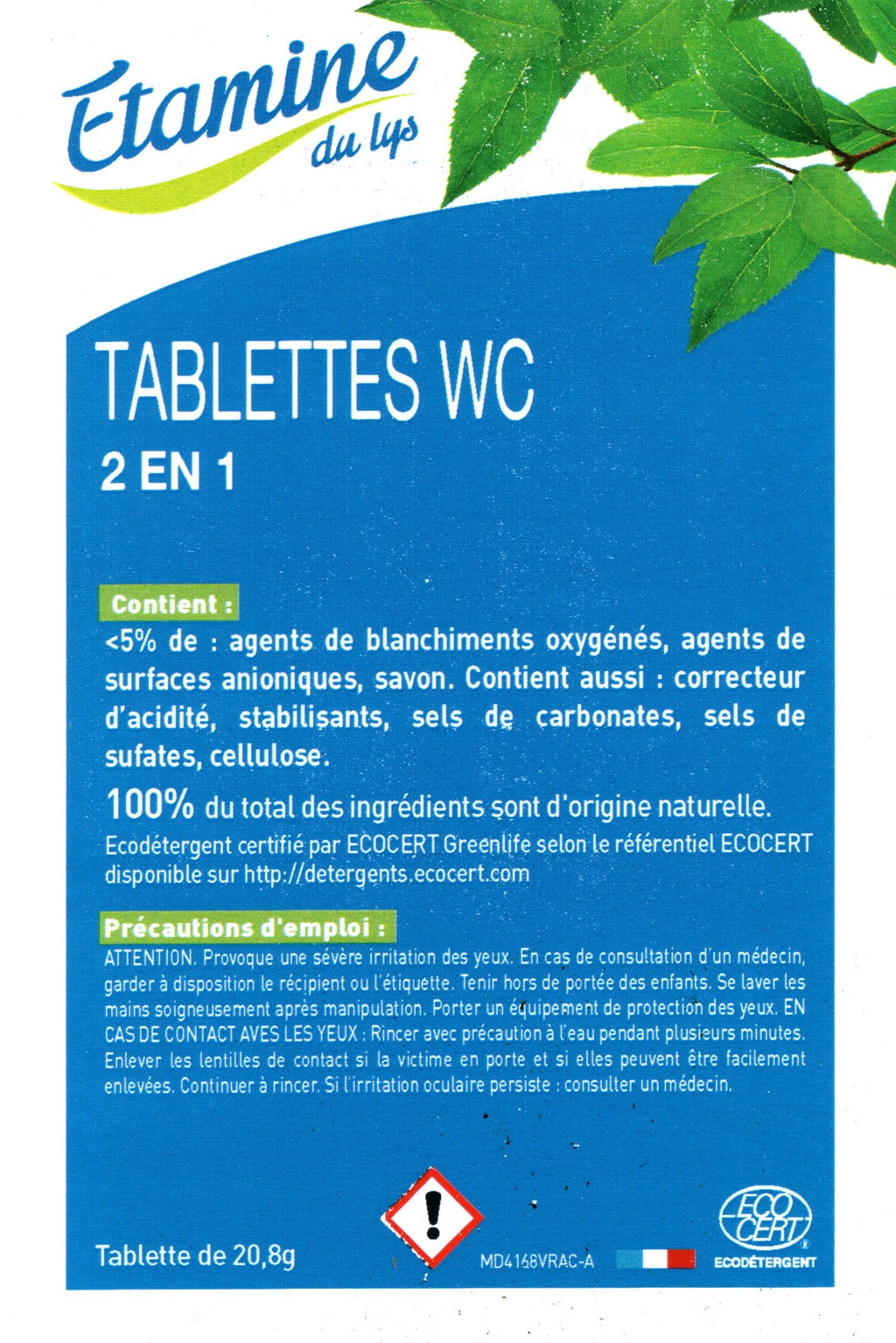 Ces tablettes pour WC 2 en 1, nettoient et détartrent sans frotter pour des toilettes propres et éclatantes. Sans parfum. Certifié par Ecocert.